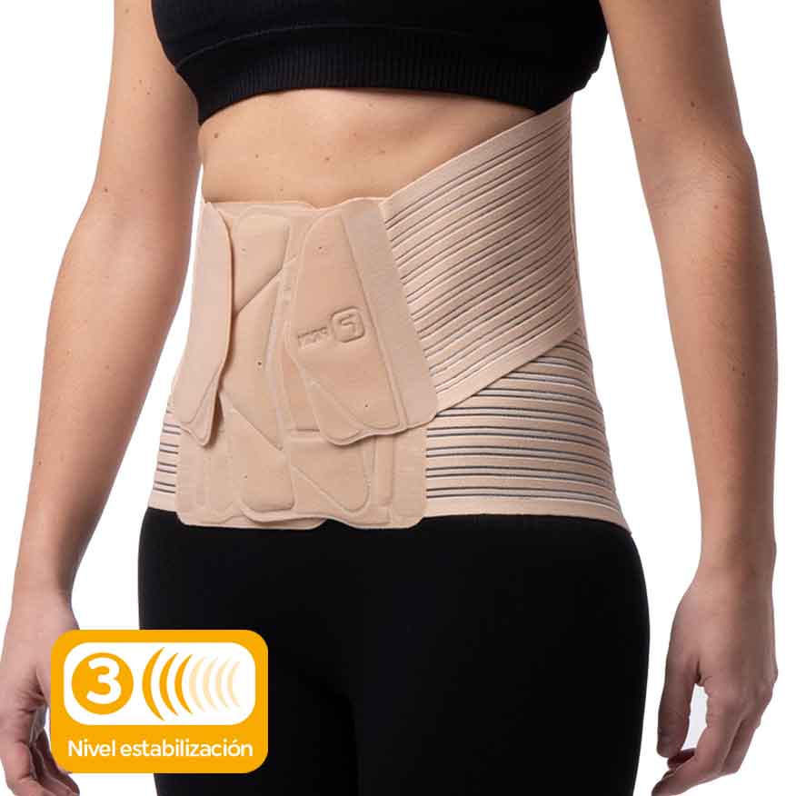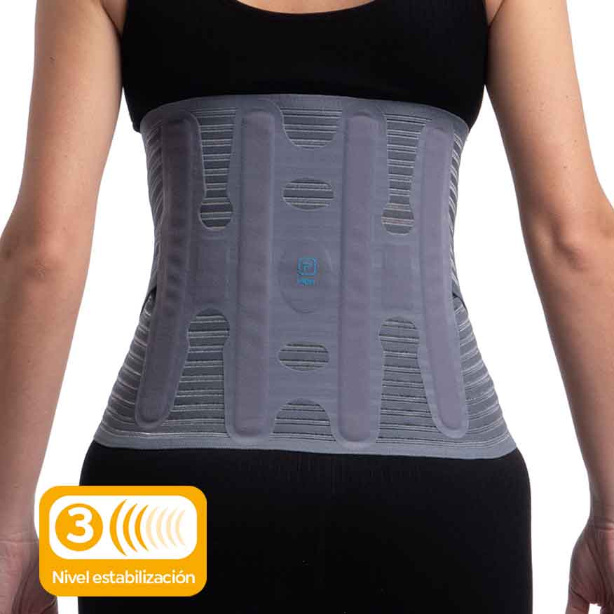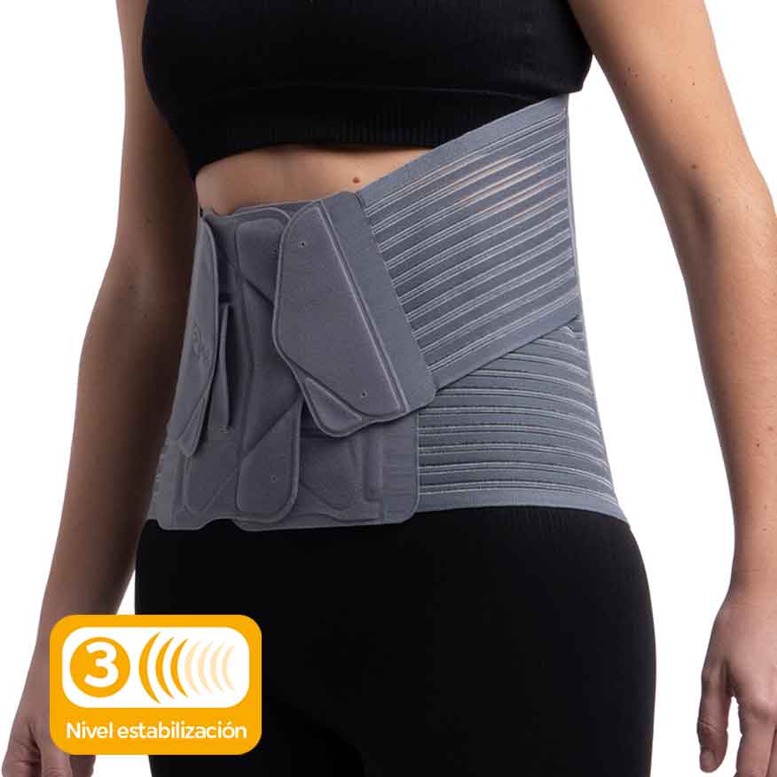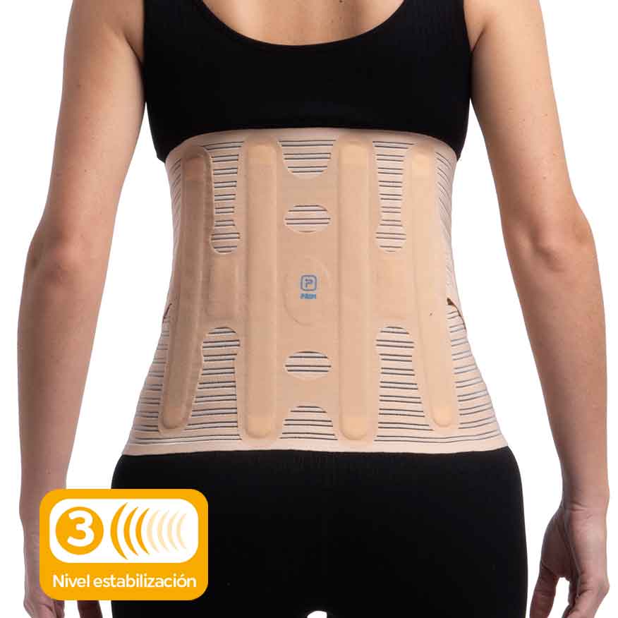 Estabilización lumbar nivel III. Su diseño, con tensores en doble banda y sus 4 ballenas de acero posteriores conformables y fijadas con una pieza inelástica de soporte, permiten alcanzar un alto grado de estabilización y contención lumbar, con el máximo confort. Especial para pacientes con diferencia cintura-cadera. Placa lumbar removible. Cierre microvelcro para un ajuste seguro. Incorpora sistemas de ayuda a la colocación. Discreta y confortable. Altura frontal: 20cm Altura espalda: 30cm