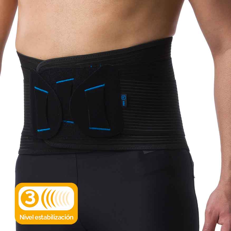 Contención y protección frente a actividades laborales. Tejido elástico de gran compresión con cierre frontal velcro. 4 ballenas de acero aportan gran contención lumbar. 2 inguinales como refuerzo. Sistema duo-control mediante bandas tensoras para regulación de la compresión. Bandas internas almohadilladas para maximizar el confort lumbar. Tiradores para facilitar la colocación. Altura frontal: 17cm Altura espalda: 26cm