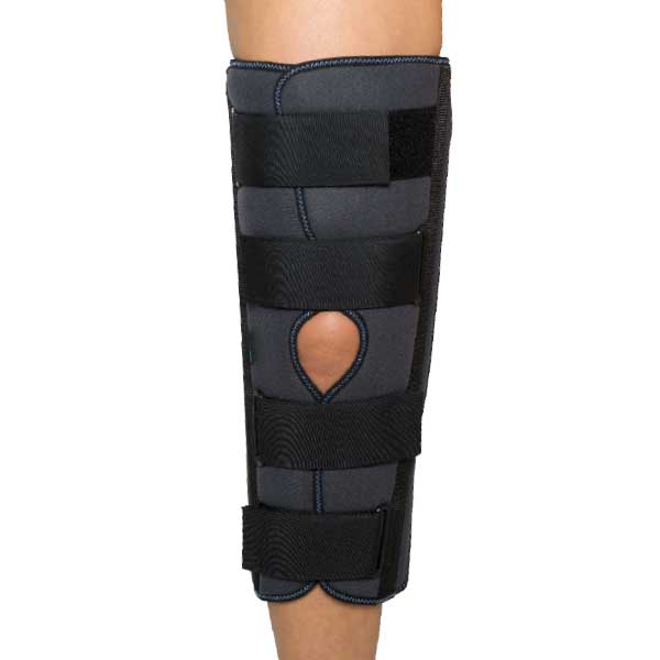 Características • Ortesis inmovilizadora de rodilla, fabricada en espuma base poliéster y duraluminio. • Incorpora 4 pletinas conformables de duraluminio: 2 posteriores conformadas en ángulo fisiológico de rodilla y 2 laterales rectas. • Cuenta con 4 cinchas anchas que se ajustan, mediante hebillas de cierre, a la anatomía de cada paciente. • Estas cinchas se colocan alternadas a cada lado para mantener equilibradas las fuerzas de cierre y distribuir uniformemente la presión sobre la pierna. • Adaptación cómoda y segura mediante velcro. Indicaciones Postoperatoria o postraumática.