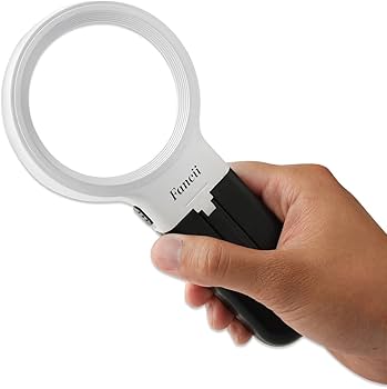 Lupa de sobremesa con base estable diseñada para facilitar la lectura o trabajos minuciosos sin necesidad de sostenerla; generalmente ofrece aumento fijo (o moderado) para ver textos pequeños, letras, monedas o detalles finos.