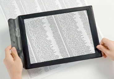 Lupa adaptada al tamaño de una página completa de lectura. Se puede colocar en horizontal y vertical. Flexible.