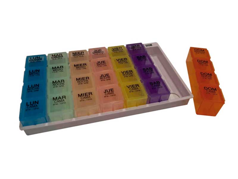 Es un pastillero semanal grande que incluye siete módulos (uno para cada día de la semana), y cada módulo tiene cuatro compartimentos para las distintas tomas del día (mañana, mediodía, tarde y noche, por ejemplo). Facilita la administración de la medicación, ayuda a evitar olvidos o duplicaciones de tomas y permite una fácil identificación visual del contenido. Dimensiones: