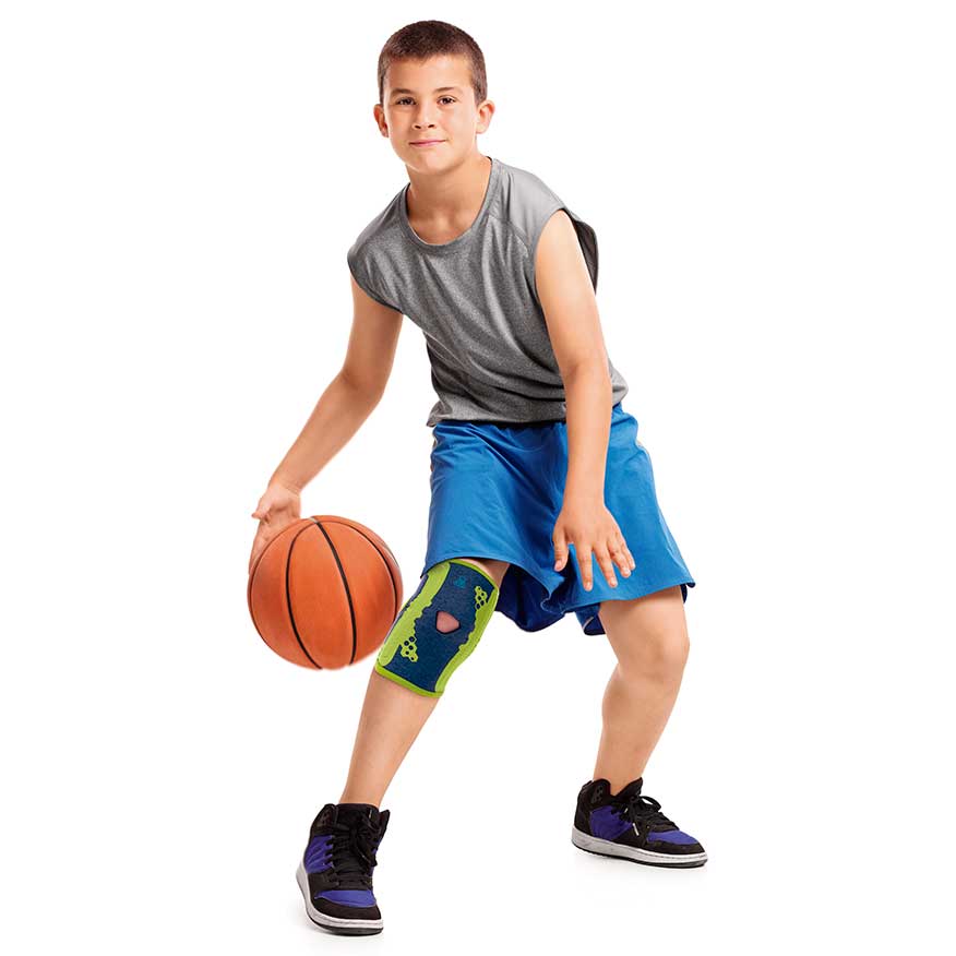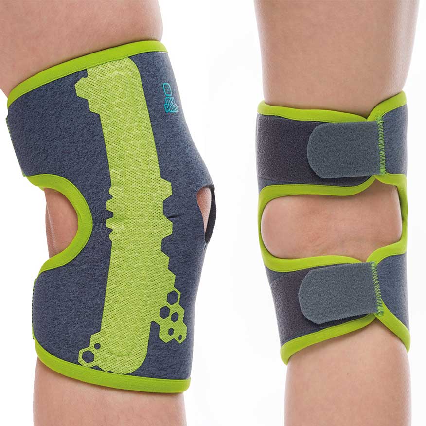 Ortesis de rodilla pediátrica confeccionada con tejido elástico transpirable acolchado y tecnología sin costuras. Incorpora rodete rotuliano con forma anatómica, removible. Con flejes laterales en espiral que estabilizan la articulación de la rodilla en sentido medio-lateral. Incluye una almohadilla patelar (solo en talla 2) anatómica 100% silicona, removible, para descarga del ligamento rotuliano. Con cierres micro-gancho posteriores que adaptan la ortesis dejando libre el hueco poplíteo. Indicaciones Contusión ligera, lesión femoropatelar. Postoperatorio. Inestabilidad leve de la articulación de la rodilla. Durante el proceso rehabilitador. Osgood-Schlatter.